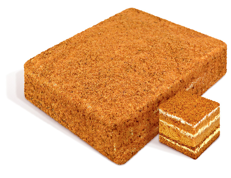ТОРТ «МЕДОВИЙ» ТМ «ЧАРІВНИЦЯ» - торт прямокутної форми, складається з шарів ароматних медових коржів з додаванням натурального меду, покритих заварним кремом з додаванням легких вершків. Торт прикрашений медовою крихтою з медових коржів.